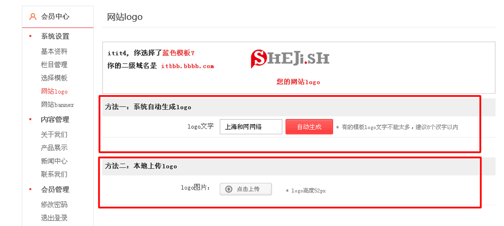 3. “网站logo”  你可以让系统自动生成logo,或者你从本地上传自己已经设计好的logo