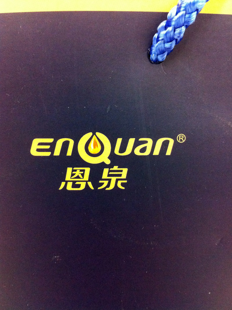 恩泉茶籽油手提袋包装设计,为着重体现产品品脾,在包装上采用简洁大方的设计风格,在颜色上,采用彰显大气、厚重的深紫色,明亮的黄色系标志设计,就脱颖而出,吸引受众眼球,不仅达到了宣传品牌的效果,而且因其选用的高档材质,也适合送礼。它的标志设计,很别致,品牌标识设计,由企业名字的全拼得来,“Q”中融入一滴金黄色的大豆油,经创意化后,使主题溢于言表。