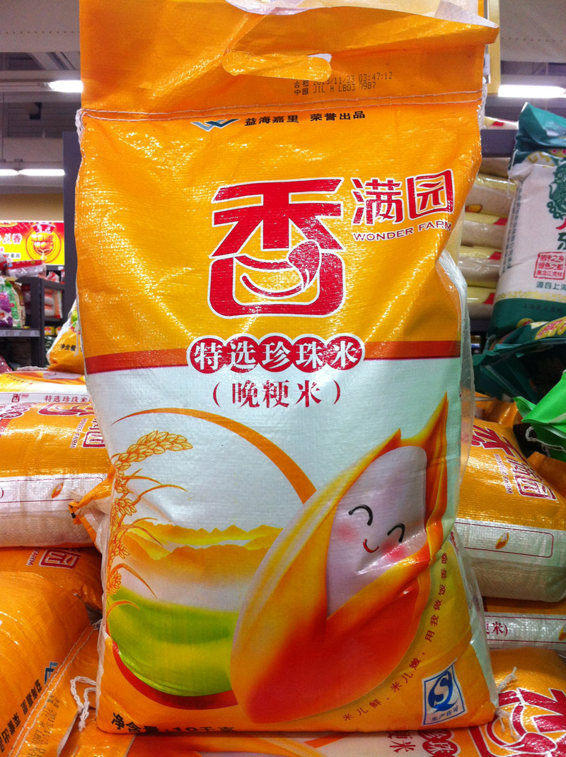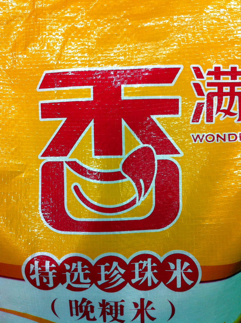 香满园特选珍珠米塑料编织袋外包装标志设计,硕大的香点明主题;特选珍珠米这五个字,位于珍珠般圆润的连珠之中,把米的特质给表现了出来;括号中的文字更是起到了解释说明的作用;三者联系在一起,排版整齐、美观,具有艺术美感。