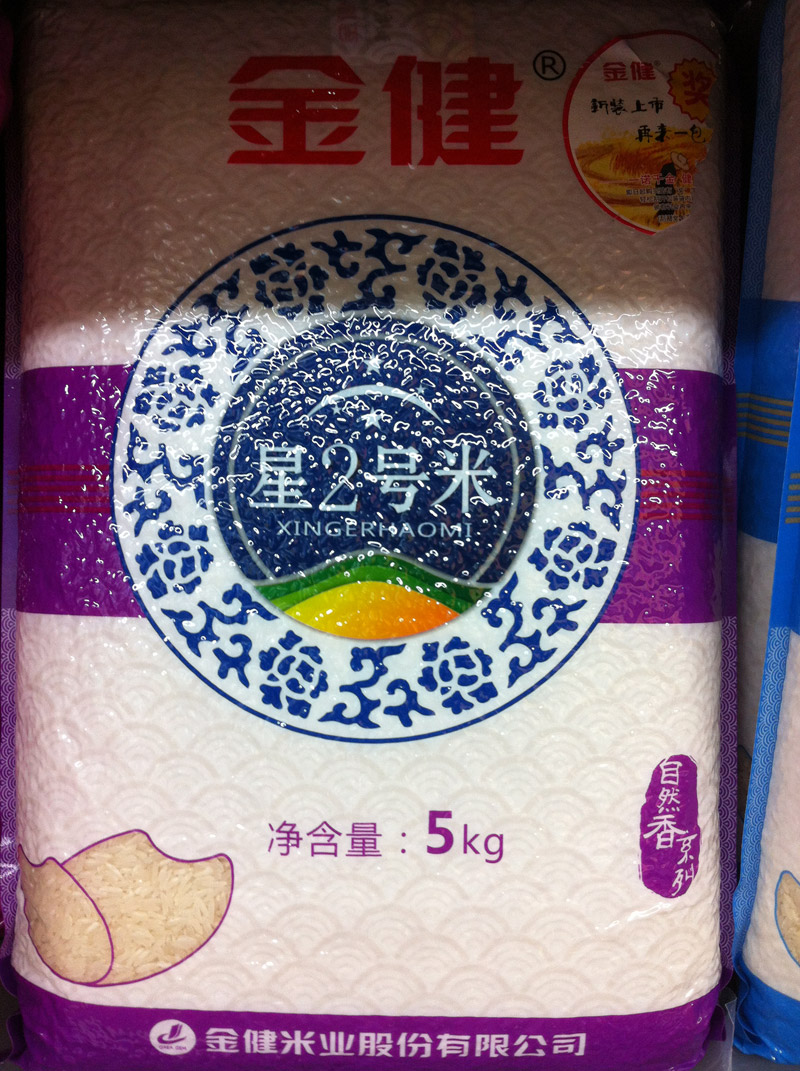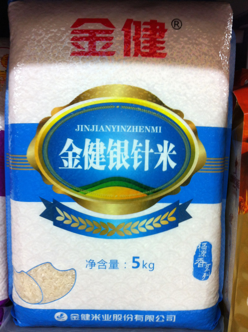 金健银针米塑料编织袋外包装设计,整体以蓝色渲染主题-稻源香。红色大大的标志设计在白色背景中突出,最引人注目的是中间蓝色丝带、黄色容器与麦穗搭配而成的品牌形象,突显浓密厚重的质地感,成功地制造了强烈的视觉冲击。