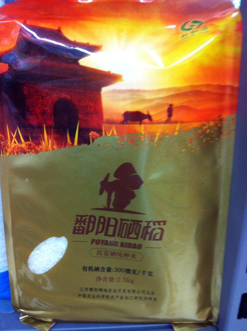 鄱阳硒稻塑料编织袋外包装设计,它的品牌标志设计以勤劳的农民为设计要素,给人以可亲、可敬的亲切感,在选图设计上,也是贴合主题的。整体观之,光芒四射的大太阳,照亮了山坡,使稻田获得充足光照,含硒量随日照而增多。这样的设计以丰富的微量元素来吸引消费者,相信在销售过程中,也会得到消费者的欢迎。