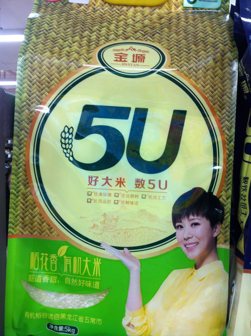 稻花香金塬5U大米手提塑料编织袋外包装设计,背景近看像草席,远看似金黄的麦穗,在它的映衬下,黄色戒指中超大号的“5U”突显出来。品牌代言人面带甜美的微笑,于无声中传播品牌信息,扩大品牌知名度、认知度等,建树品牌美誉与忠诚。可见,大品牌的实力与魅力。