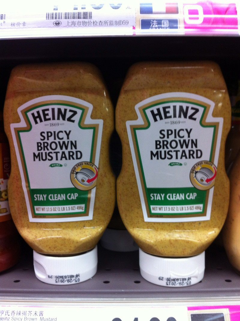 亨氏HEINZ香辣芥末酱透明瓶体外包装设计,它的瓶体外形设计握在手中很舒适,可倒置于货架上,以一种创新、新颖、独特的姿态展现。黄色/产品色、绿色瓶子边框的设计,使得整体,看起来简单而不乏味,HEINZ追随边框设计呈现弧形状,发挥着老品牌的魅力。