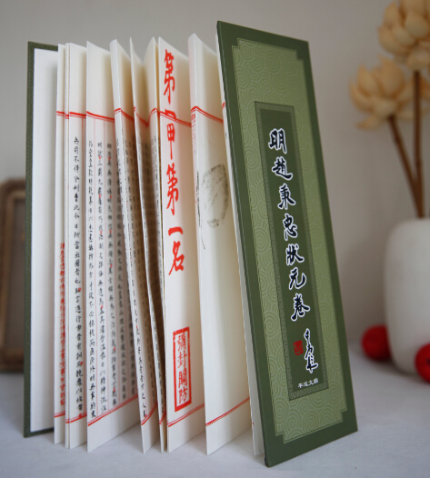 这款古代《状元卷》书籍设计是典型的经折装,也称“折本”、“折子本”,就像古代奏折一样,设计成折叠成册的形式,展示出对古籍经典的虔诚与恭敬;其制作工艺是把长幅卷子一正一反折叠成长方形书本形式,并在其前后两面裱上硬质而分量感十足的古典印花纸板作为封面和封底,阅读时只要把它拉开,就变成一本书的形式了;其内部竖向的文字排版布局清晰,疏密有致,并进行了适度留白,虽然是繁体汉字,但其方正规整的字体结合其排版规整的视觉空间层次,使读者在视觉上张驰有度;其冷色调的墨绿色封面底色上叠印螺旋形古典印花、竖式的书卷名和古典红色印章,透出浓浓的中国古典韵味,给读者以宁静致远、清心寡欲之感。