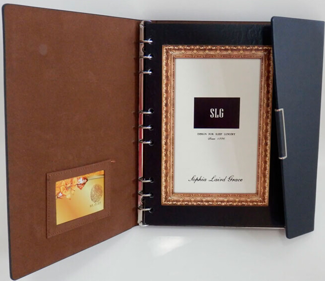 这是一本采用“螺旋活页装”装订工艺的宣传画册,其螺纹金属圈穿锁扣成的单页之间互不粘连,客户可随时打开画册锁扣,调换书页,其内部阅读内容随心变换。特别适合需要经常更新内容并可随时抽出来、补充进去的企业进行宣传画册设计,创意灵活,新颖美观。常用于产品样本、目录、相册等。活页订的其他常见形式是穿孔结带活页装、梳齿活页装等。此枣红色的页面用色凸显产品尊贵气质,厚重感十足的硬质纸张瞬间提升品质感。右侧页面上的相框式的烫金印花设计,不仅融合了西式经典气息的花纹,更显示出尊贵的金属质感及强烈的雕塑立体感。简洁英文与适度留白的点缀更添一抹低调奢华有内涵的赶脚。由于采用了牛皮风格的胶质软皮,不仅质感好更可保护内页内容,左侧封皮内页创意缝制的小软皮形成一个“兜”的形式,可以放一些纸条便签等东西,方便实用。