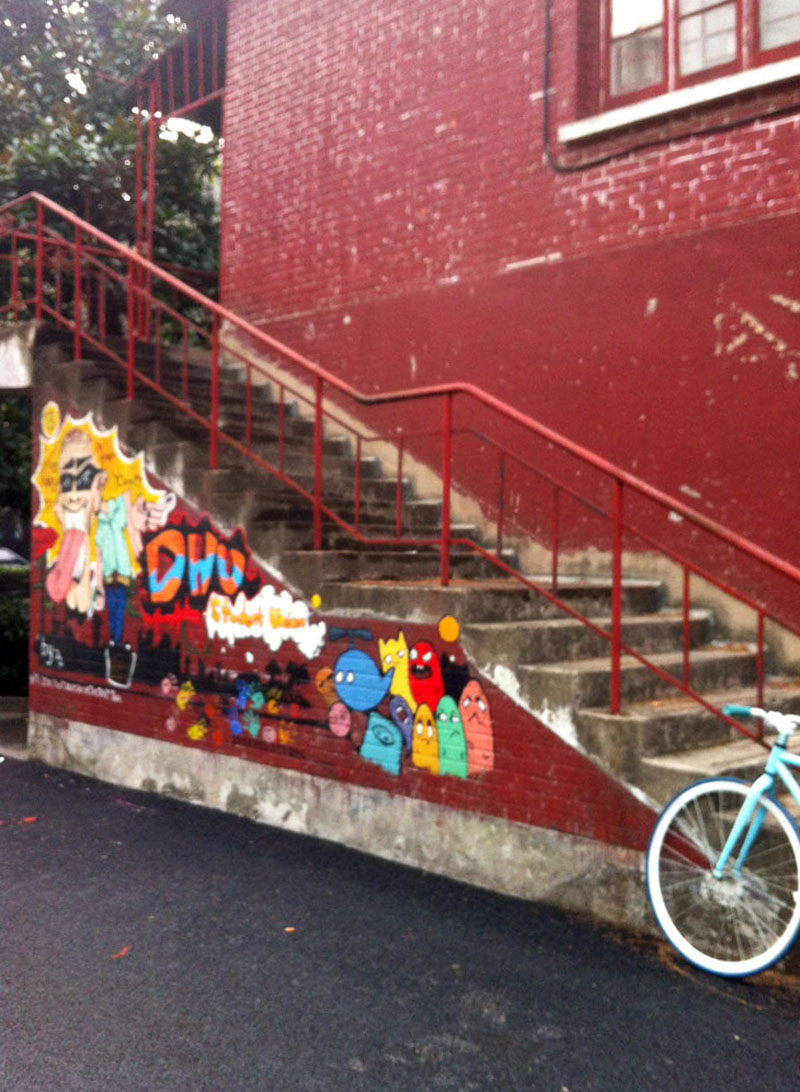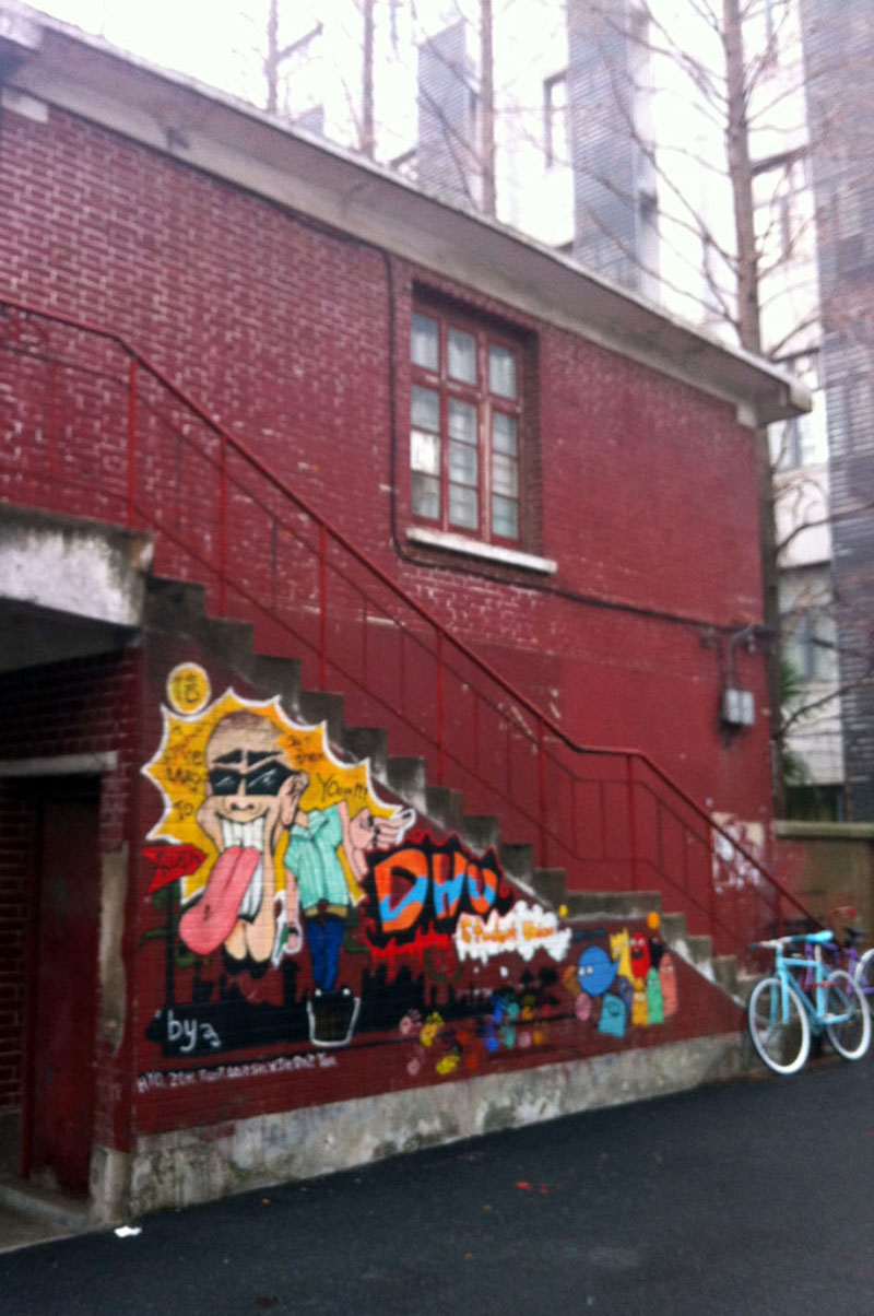 DHU上海东华大学校校园内的学生楼墙面搞怪人物手绘卡通涂鸦绘画