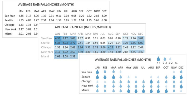 这个图给他留下了非常深刻的印象,这个例子通过简单的图形变化让降雨量信息一目了然。信息可视化是一门了不起的学问,需要设计者既有很好的交互意识,又要有一定的图形设计能力。