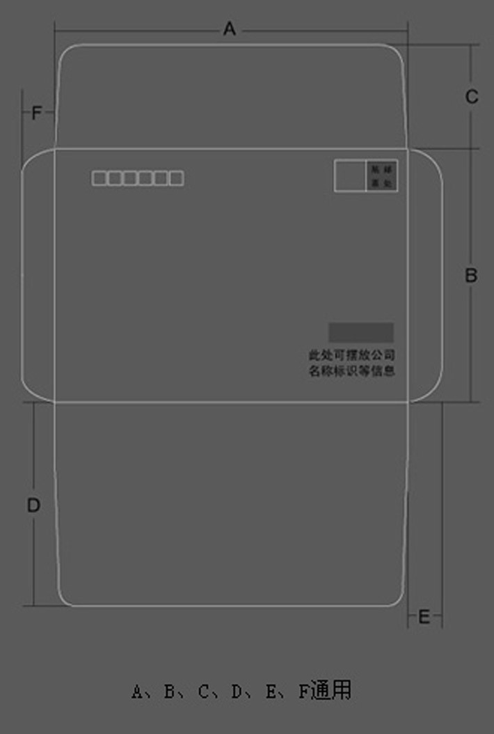 2、信封正面左上角的邮政编码框格颜色为金红色,色标为PANTONE 1795C。