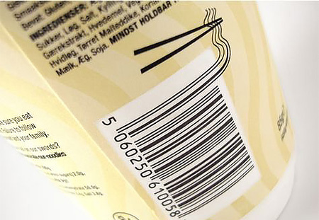 此面条包装条码的创意之处,由一般条码演变而成的面条形状,又被筷子夹起来,这样的设计具有引导力,且顾客在收银台结帐时也可以看到此创意标签,心里或多或少都会被其创意惊到。