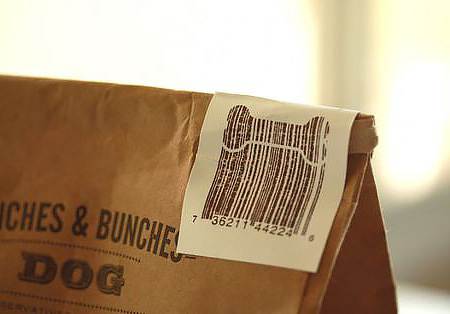 此款狗粮包装条码的创意在于选用了狗最爱的食物-骨头,由骨头作为主设计元素,也是蛮有趣的。