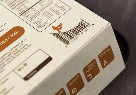 此国外纸质包装设计,其条码的创意在于其形状的创意,呈一个过渡型阶梯,一只鸡在沿着“阶梯”悠闲散步,整体传达出的是一种和鸡相关的安全、健康的食品形象。