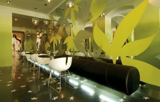 圆形餐馆,高级酒店里面餐厅也设计的非常别样精致,以圆形的外表建筑,配上淡土黄色和黑色的树叶作为墙纸,给人耳目一新,沉醉其中的清新感,非常现代化的设计。