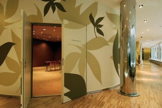 大堂展厅的玻璃墙,以土黄色带点绿色的叶子做为玻璃墙的墙纸,深浅不一的黏贴在玻璃墙的不同位置,让客人一进来就感受到温馨的气氛。