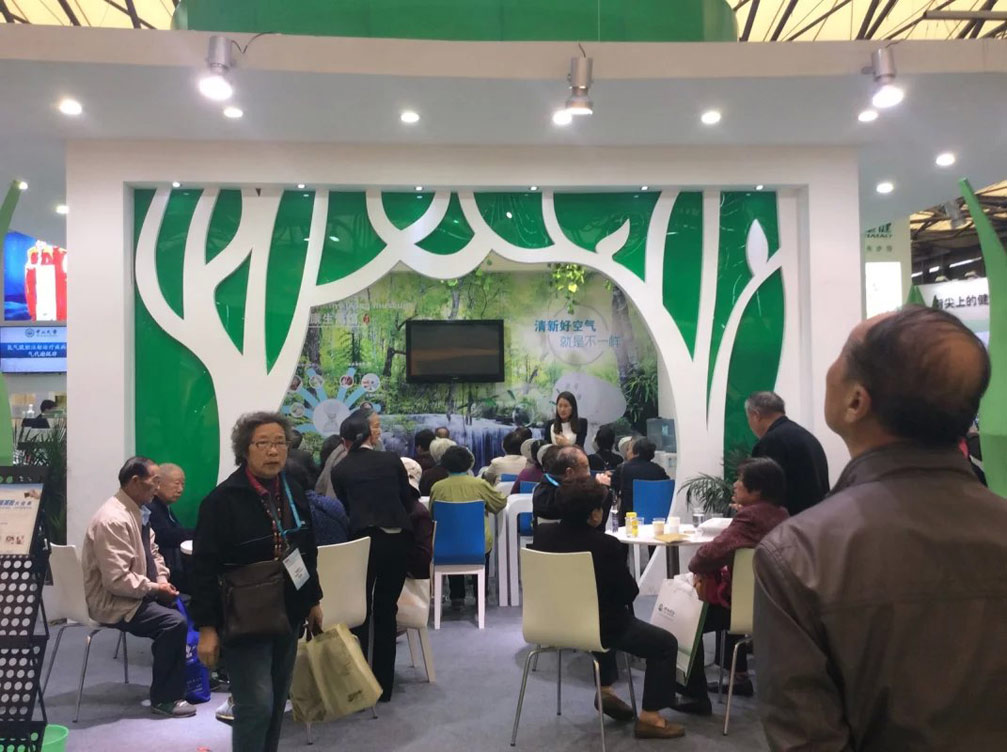 只见展位W4 C32位置,聚满了老年人——此次展会的目标主力, 难道清新好空气就是不一样,这一句宣传标语就这么有魔力?小编来到喧哗的现场一探究竟,原来是量健企业在搞送礼活动,热闹非凡。咱先来看一看企业都送了什么礼给大叔大妈们,就把他们“请”进了展位中,原来他们不仅送企业产品,还一并把宣传品,送的吉祥物一并整齐装进了,带有企业商标、LOGO的手提袋里,这一举动吸引了众多尝鲜的人,蜂拥而至,可忙坏了现场的服务人员。
