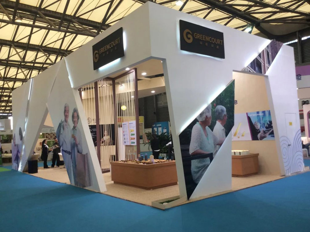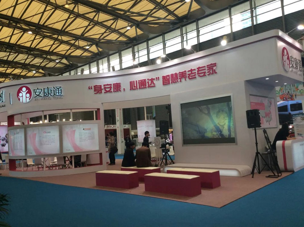 安康通品牌-“深安康,心通达”智慧养老专家的展会造型在色彩与整体的设计引人注目