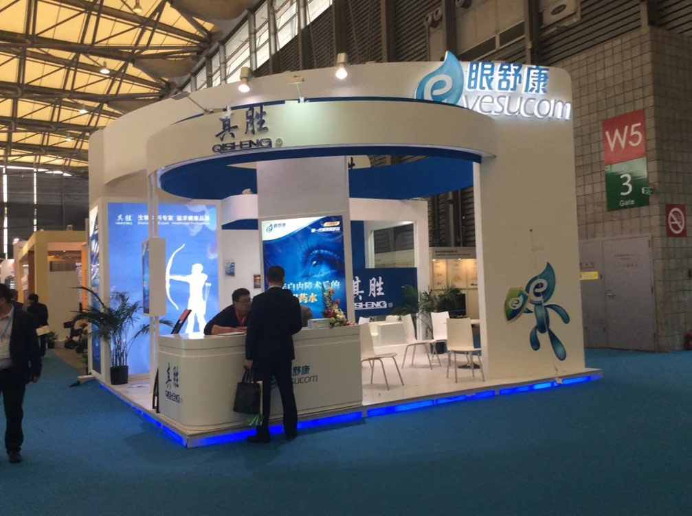 眼舒康品牌在展会现场,立体展厅造型设计、灯光、及宣传海报设计的色彩遵循了其LOGO的主色彩,给人一种高端、真实的品牌形象。