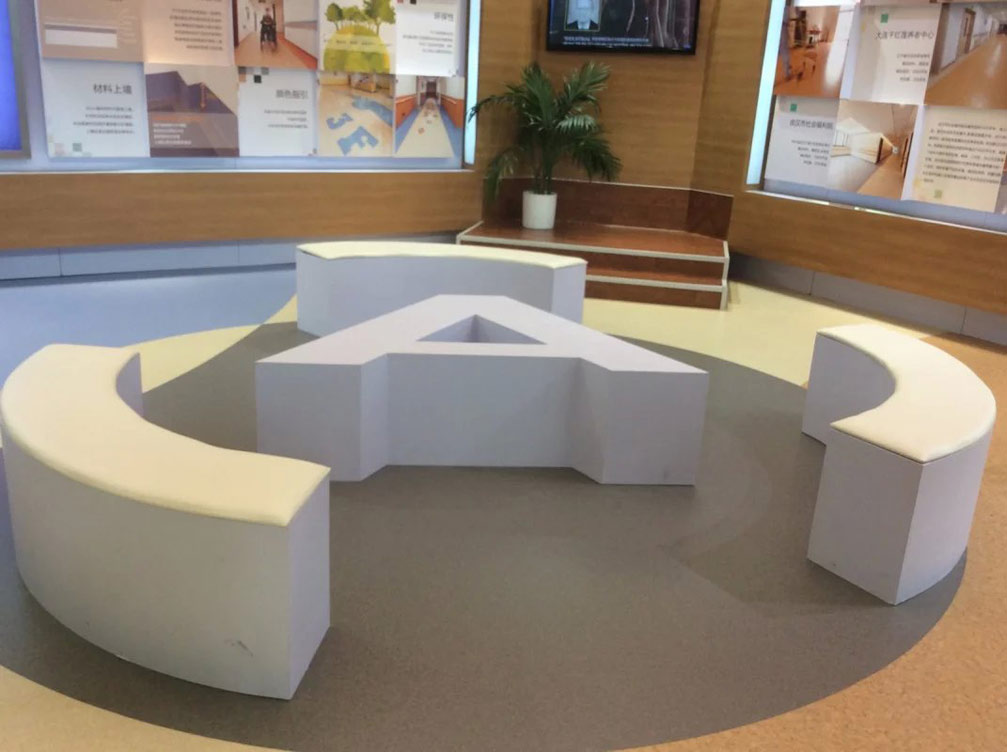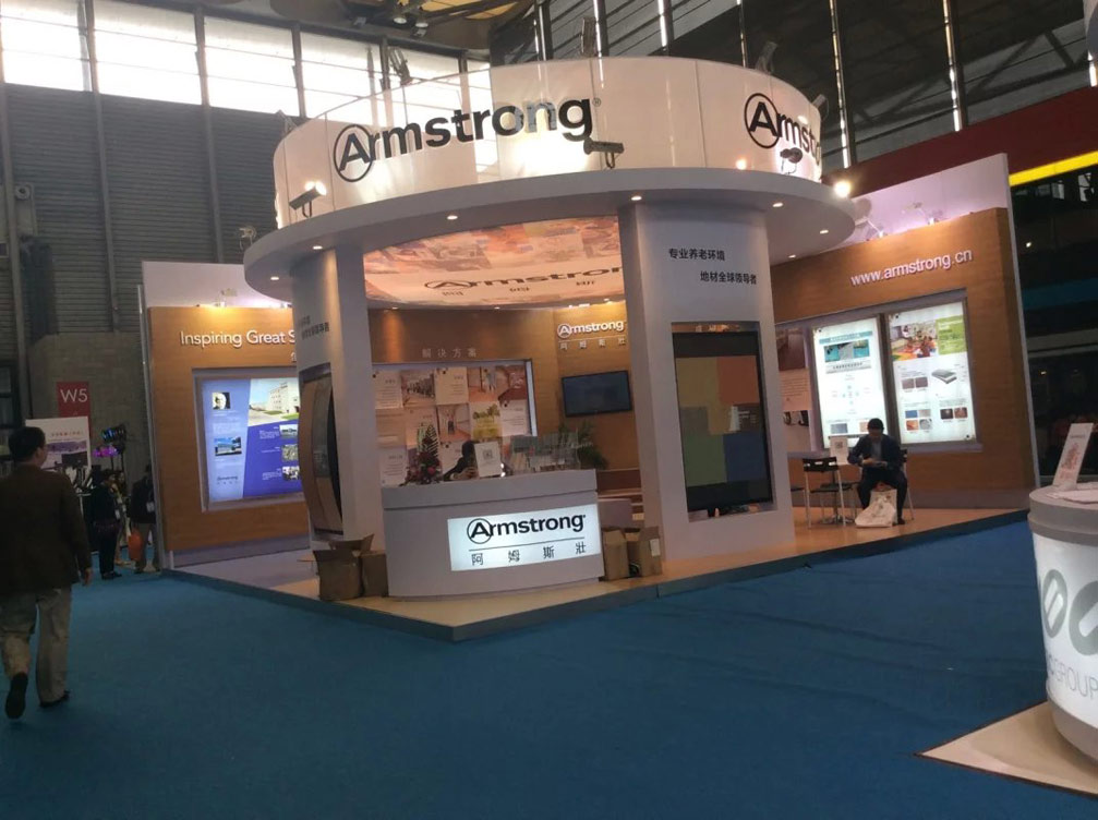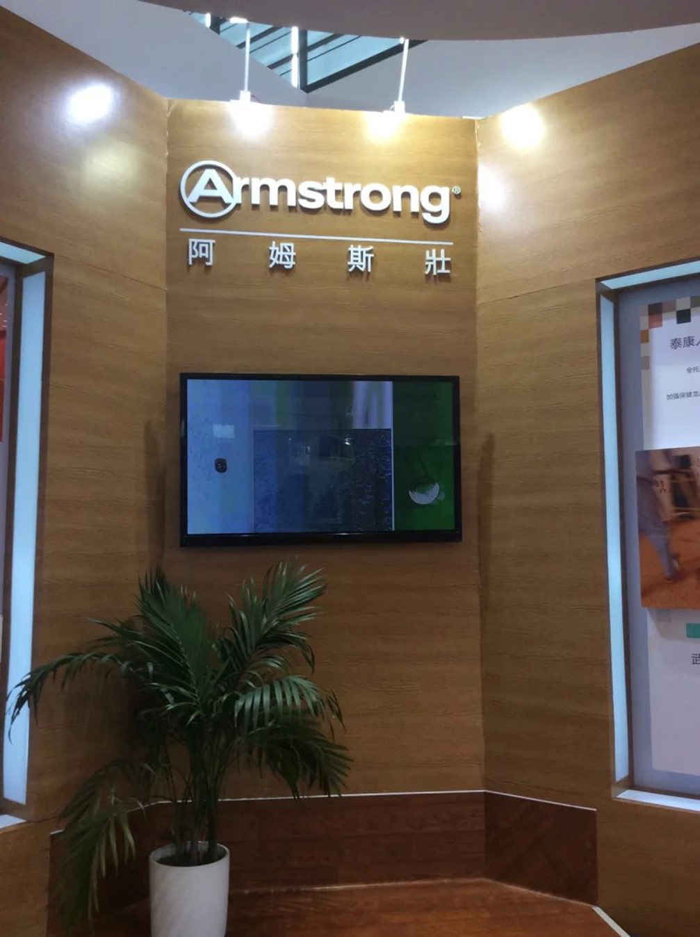 阿姆斯壮(Armstrong)品牌地板系列广泛应用于医疗,办公,教育等领域,其外观造型高端大气,时尚,巧用圆柱塑造了一种标志突显的形象,当然其内部设计与产品样本展示也是较为豪华的。“LOGO墙”灯光闪耀,地板产品展示凹凸特效,整齐展现,拐角处造型巧妙开发设计,放宣传视频,更为创意。就连其中间展厅造型,也与品牌相关,环绕沙发中的“A”正是企业Armstrong商标中的A,且沙发材质舒适,美观好看。