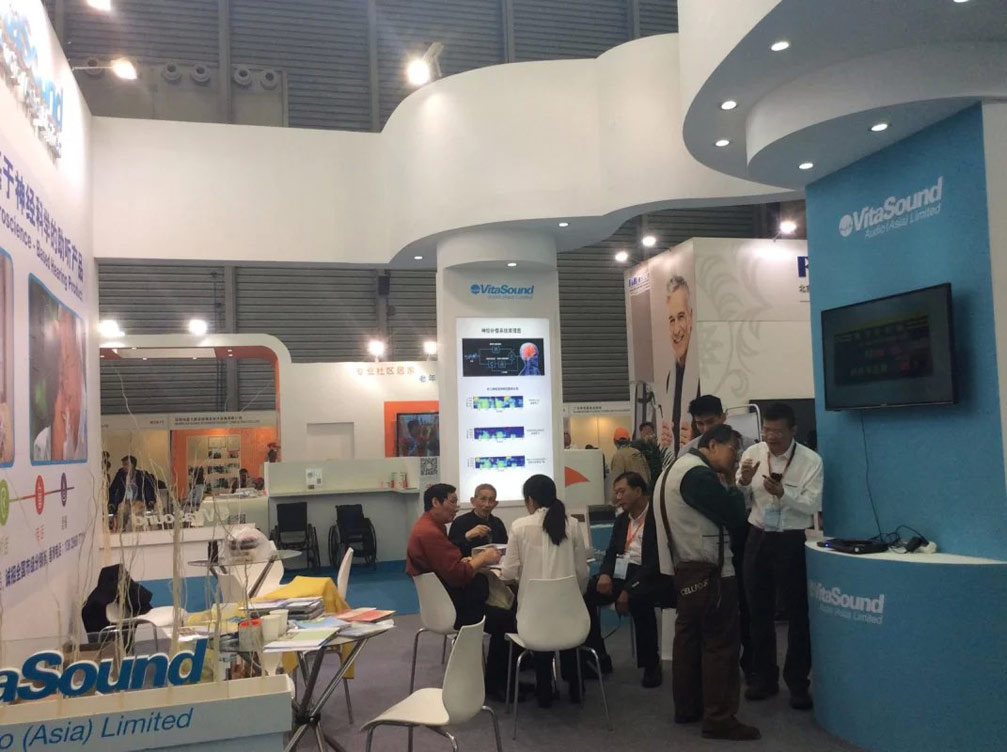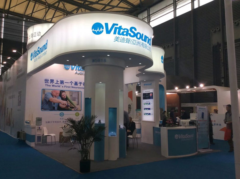 美迪陆(亚洲)有限公司-VitaSound展会造型气派,展位区域比较宽阔,彰显大型企业的体面风度,除此之外,其展示架、展示台、桌椅、宣传器材和宣传资料,点缀的灯饰、盆景花束等的选择与摆放,也较为吸引人。