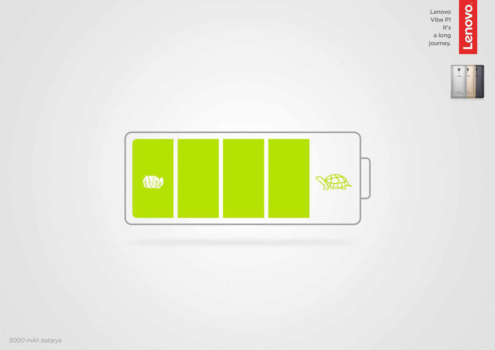联想Vibe P1被号称为“及生产力和安全于一身”的超级续航怪兽手机。Lenovo Vibe P1电池容量高达5000mAh,能够提供81小时的续航时间,可谓续航手机中的战斗机。由国外广告商FCB Artgroup代理设计的此款手机海报设计,以腹足纲陆生软体动物代表蜗牛及半水栖、半陆栖性爬行动物乌龟为代表的两种动物作为设计主题,借由他们的共同特点:行动缓慢性来诠释联想Vibe P1手机的持久续航功能。“It's a long journey”这是一个漫长的旅程。从广告中我们可以直观的看出蜗牛或乌龟想要吃到食物,必须爬行很远,由于速度慢,这中间的路程是非常漫长的。广告画面中用电池表示爬行类生物与食物之间的路程,将食物与动物分别放置在电池的正负极两端,当动物吃到食物的时候就代表手机电量耗尽了。设计师希望以此来传递超级续航手机待机时间长这一显著特点,直观而形象。是不是有种想跃跃欲试的冲动,看看是不是如广告中说的那样神奇、持久。当然对比其他国产机“充电5分钟,通话两小时的”广告卖点,“It's a long journey”配合广告设计稿,是不是更加的形象有说服力,当然广告设计的最终目的是为了促进产品的销售,至于是否像品牌所说的那样续航持久则需要消费者自己去辨识。