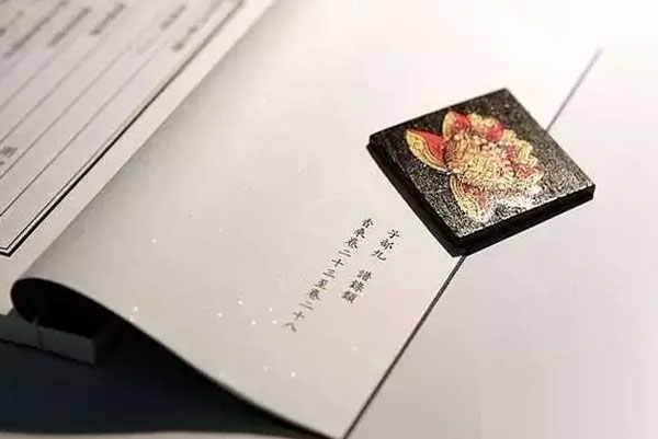 在封面上贴上家谱名称标签,签条的位置对家谱的外观也有一定的影响,一般多是黏在封面的左上角,离天头和前口各约812mm。也有节约成本的做法,就是在设计家谱封面时,直接设计印制在封面上,这样就省去了做、贴标签这一步。