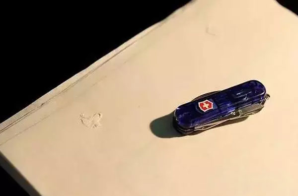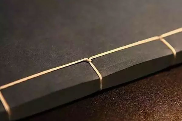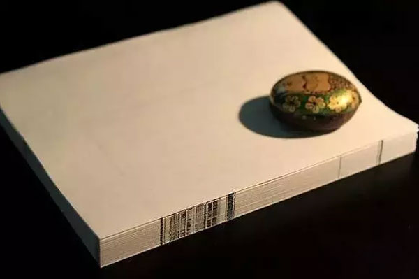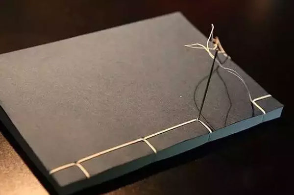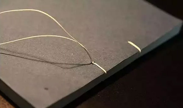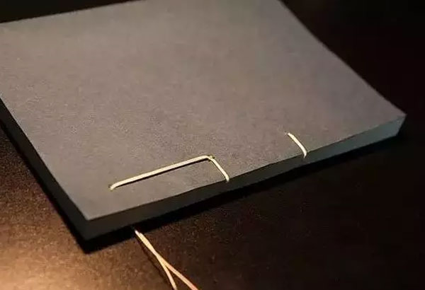 加入扉页后,夹好齐栏的书页,计算好最后裁切的位置以及钉线的孔位,在书脊和钉线孔之间,上下离书口三分之一处,垂直打两孔。将裁纸所剩余料,揉搓成两个线状纸捻,自孔中穿过整个书脊压平纸捻。将多余的部分剪去,捻端展开粘牢,重物压平。