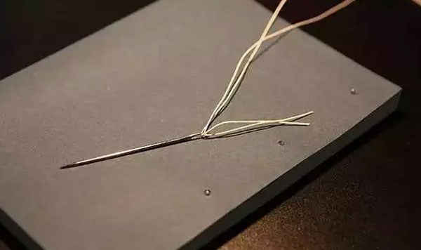 11、穿线,穿线要使用双线,按照不同的穿线方法,如线位置要正确,松紧度要适度。家谱穿线后平整牢固,双股线并列排齐,无扭线、交叉、重叠、分离线,最后一孔结束时打结,再在这个孔穿出去,在另一端剪断,把线头塞入孔中,藏住线头,使线结不外露。